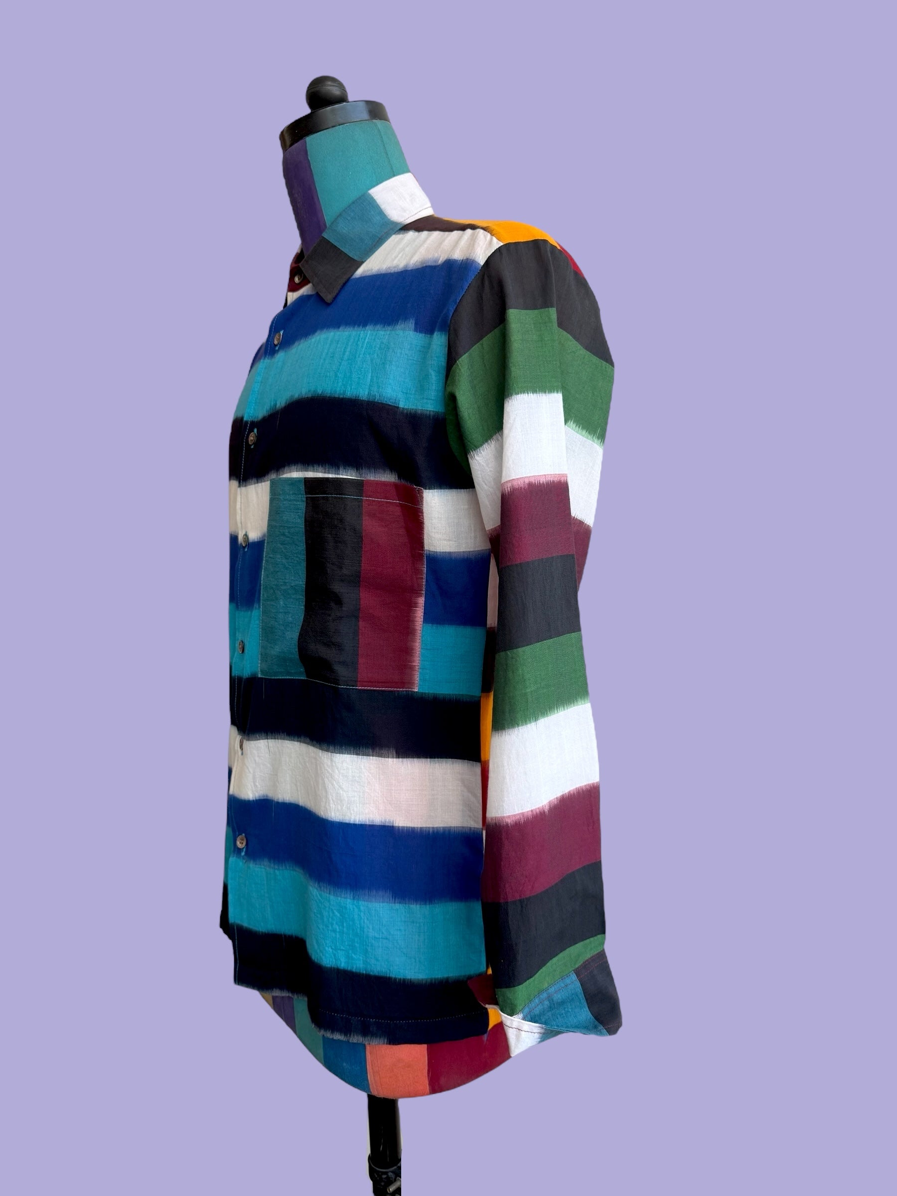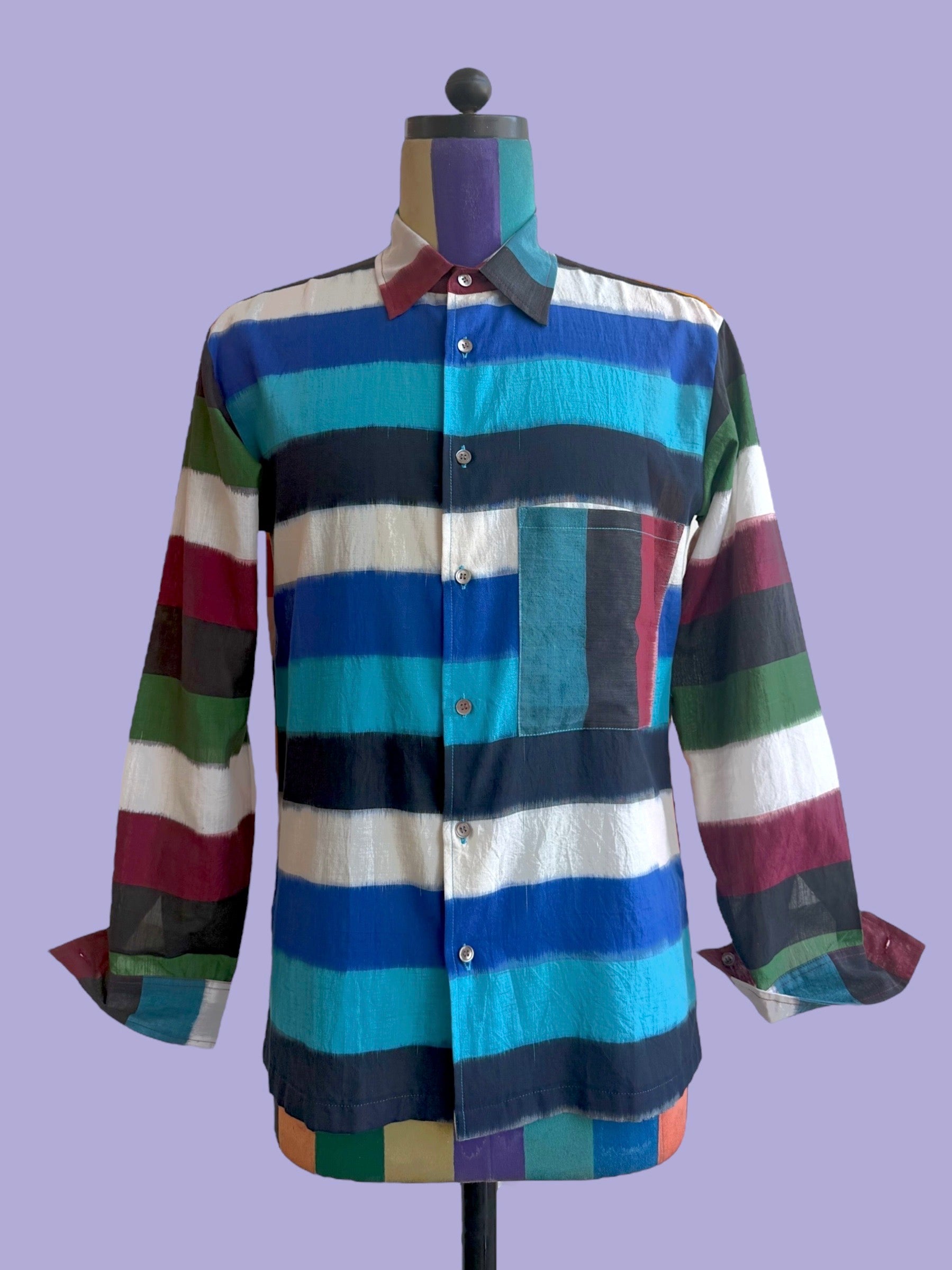 Long sleeved cotton shirt with a pocket, in a mix of weft, resist dyed ikat stripes. Blue, green and orange